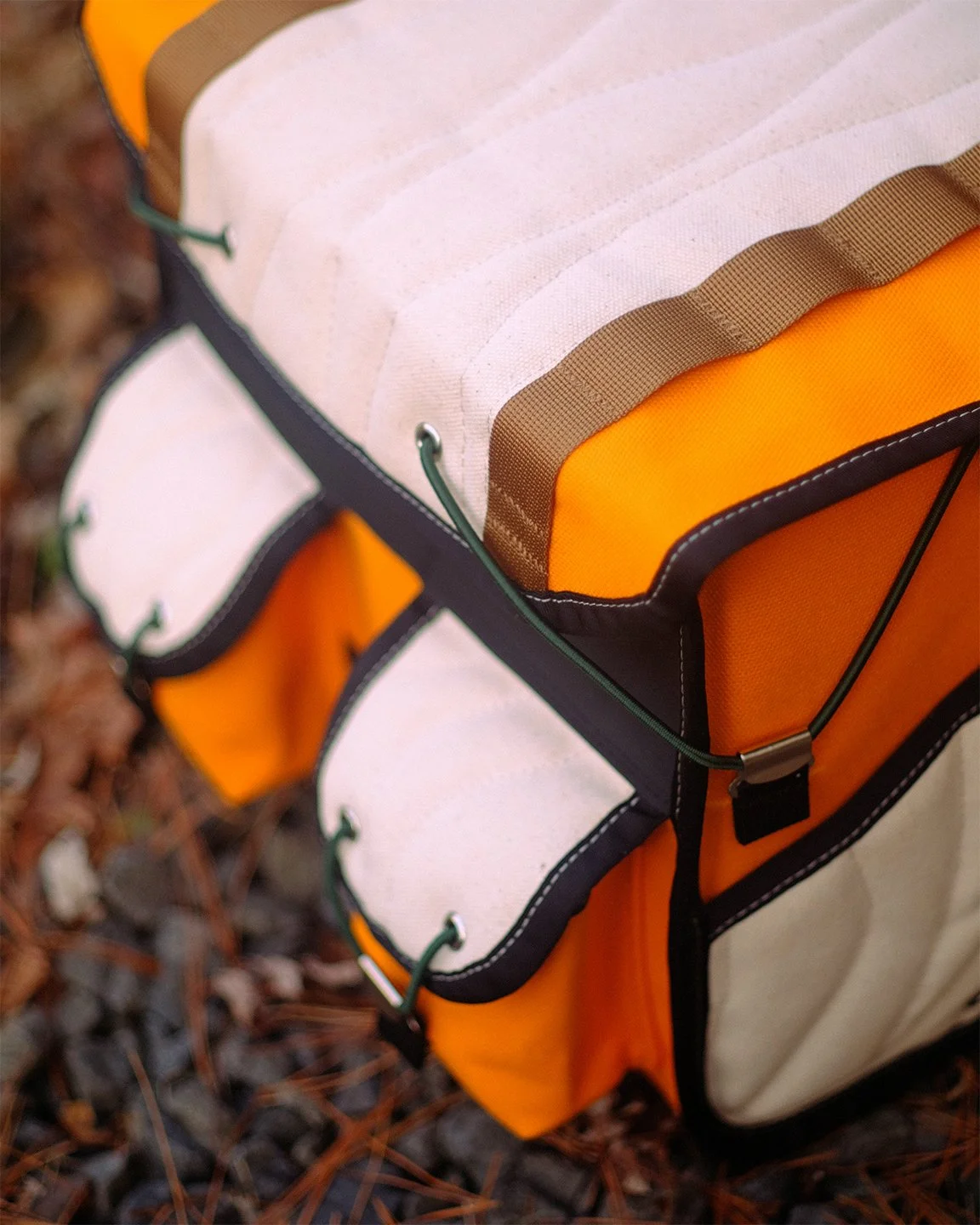 Made with gold no 8 duck canvas, a color that’s highly reactive to light and fluctuates between a deep goldenrod or canary yellow to a fiery sunset orange, these bags have natural undyed center panels with freeform quilting, emerald green shock cord, brown straps, and black trim with off-white contrast stitching to. Think high-vis but keep it earthy and subdued, these are much more at home on a vintage build than proper blaze orange or fluro yellow. Most of the photos tend to make them seem more on the orange side, but that was just the light at that moment. There’s a close up tag photo that’s a good example of how much more yellow it looks under indoor blue light. Liner is aforementioned blaze orange, this time in recycled 400d instead of my standard 200d which has been out of stock for months sadly. You’re looking at duck canvas bags with purely aesthetic quilting though, you can deal with a few extra ounces from a stronger liner.