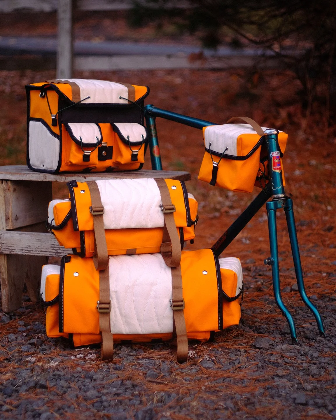 -Modular Ramblonneurs are my take on the classic randonneur bag, with webbing that makes them compatible with all the same accessories as my flap and roll bags. Read all about them here. Shown in the photo is the short model, only flat side pockets this time around.